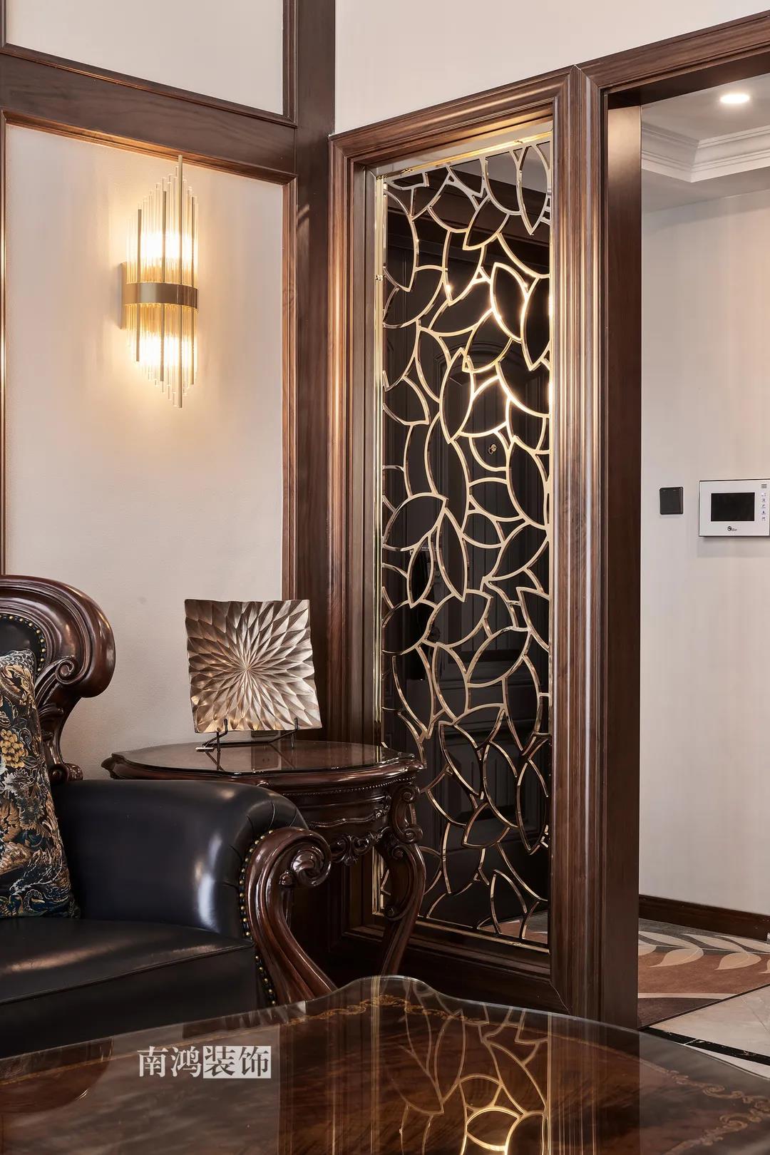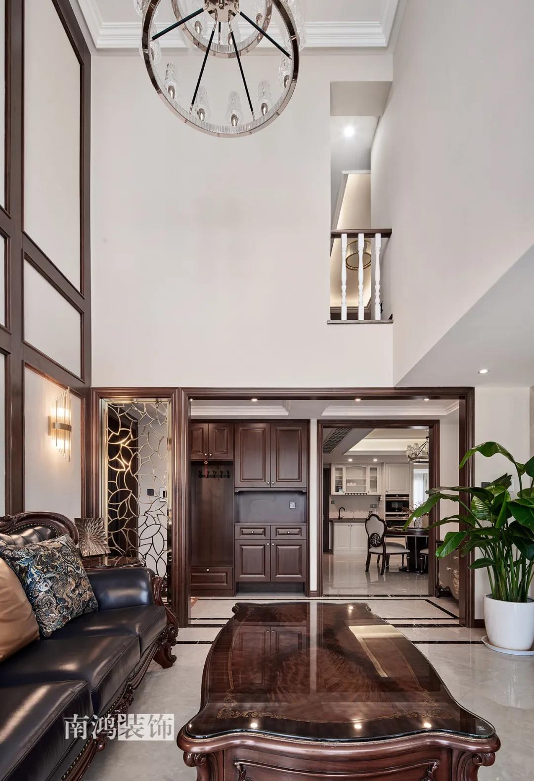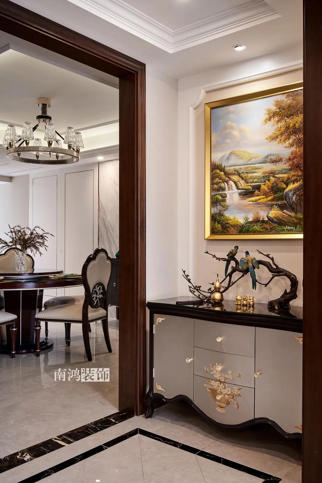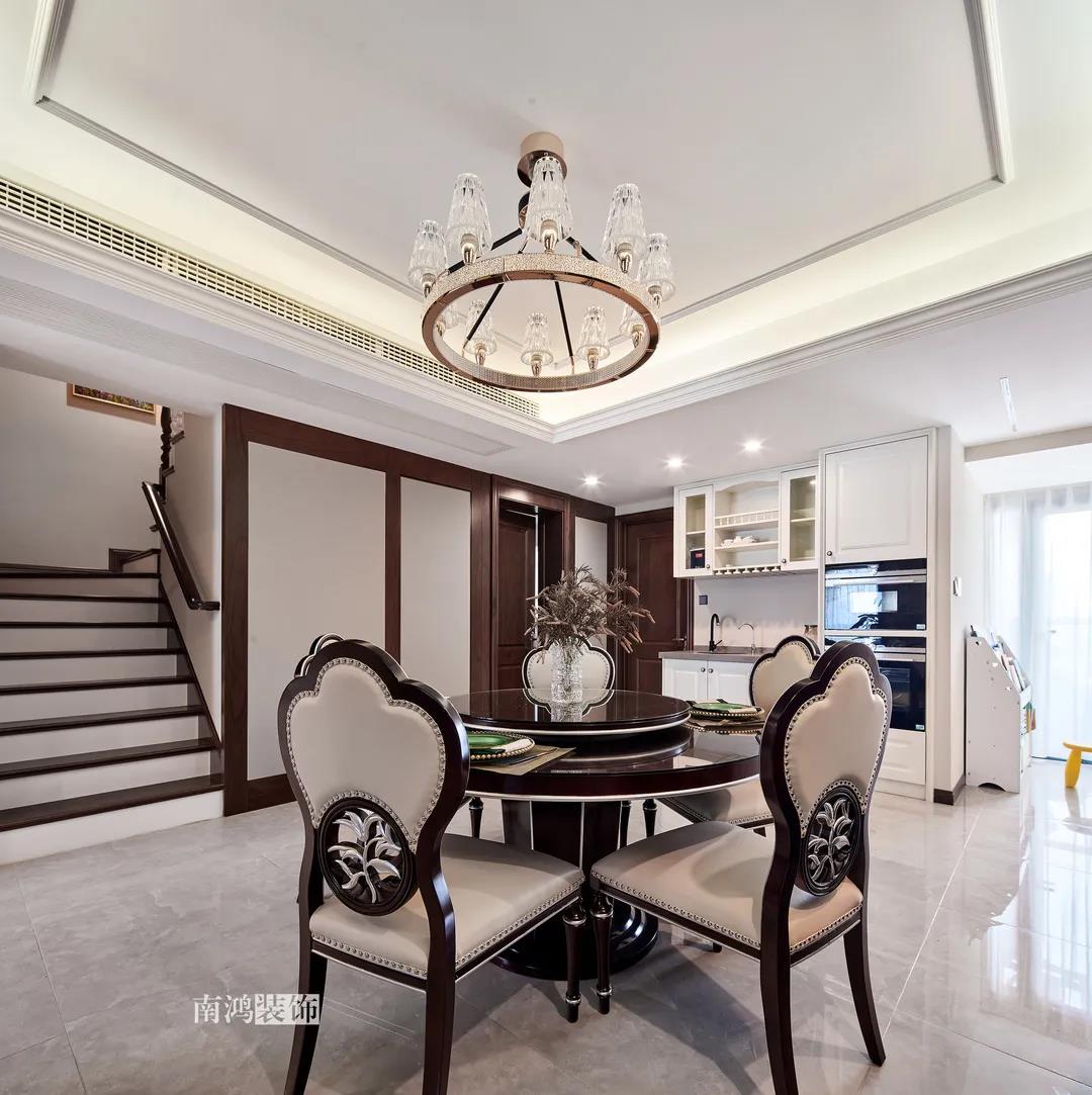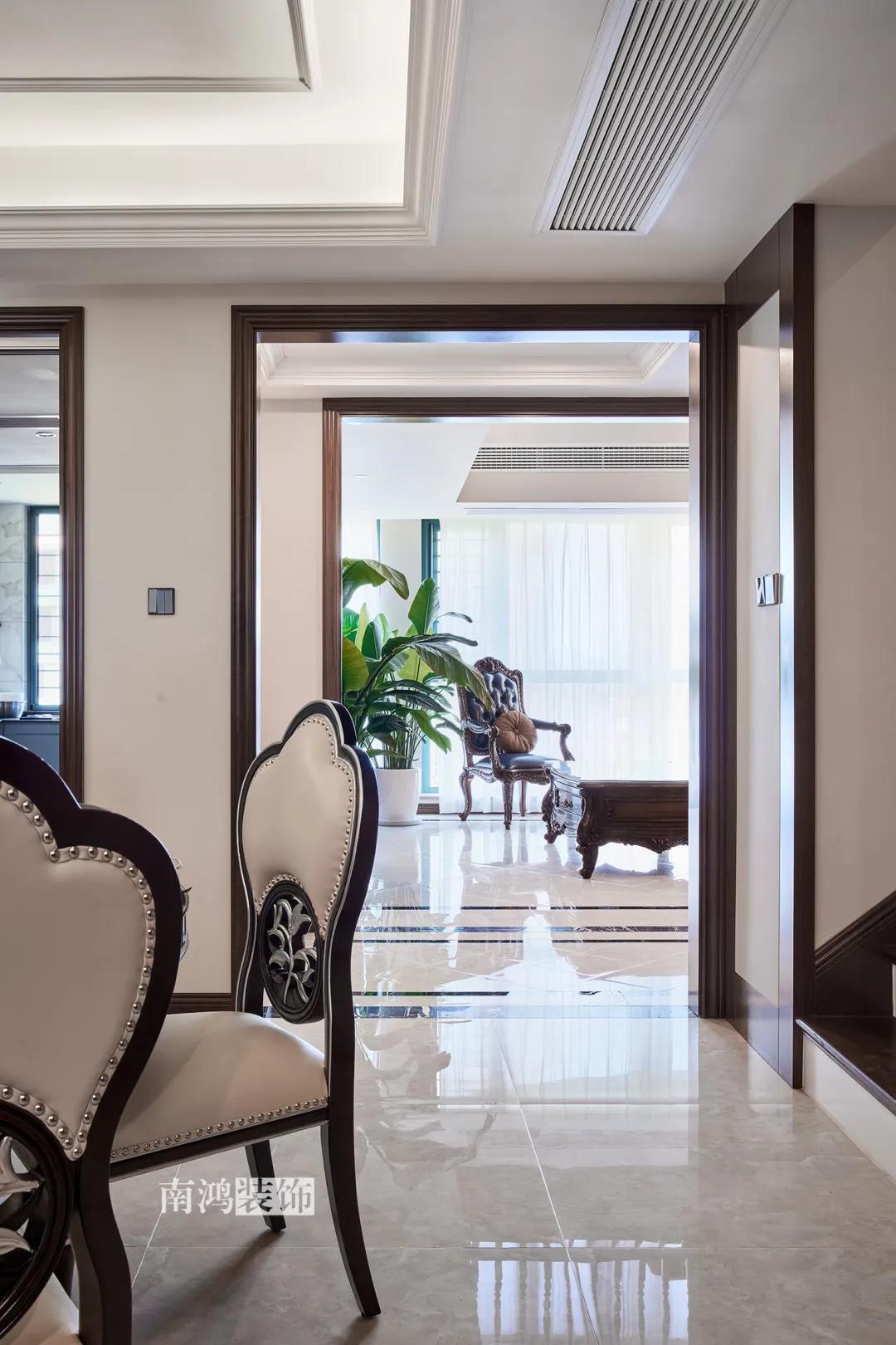 全屋雜糅了新古典、美式、中式、現(xiàn)代等風(fēng)格的軟裝陳設(shè),不同的空間有著不同的空間表情,想必每日住著看著都能感受到不一樣的趣味~ 01. 玄關(guān) ENTRANCE 正對入戶口的玄關(guān)走道,盡頭處用矮柜輔以金框風(fēng)景畫和擺件打造端景,實現(xiàn)高雅藝術(shù)表達(dá)。 02. 客廳 LIVING ROOM 轉(zhuǎn)入客廳,挑高的空間氣勢十足。軟裝材質(zhì)、色彩選擇,傳達(dá)出濃厚的歷史文化底蘊(yùn),契合業(yè)主對高檔格調(diào)的追求,同時在硬裝上簡化線條,空間更加明晰可觀。 為了滿足大家庭的活動需求,設(shè)計師將原有的客餐格局重新規(guī)劃,一層客廳在最大范圍內(nèi)打開,讓光線與氣韻流通,形成一個視野開闊、采光良好的會客休閑領(lǐng)域。從這里可以看到二樓孩子的學(xué)習(xí)讀書角。 5.4米的沙發(fā)背景墻自然成為整個客廳的視覺焦點,設(shè)計師選擇了護(hù)墻板的形式,木板分割出的造型有助于進(jìn)一步拉伸層高,大氣高級的效果貫穿一二層空間。 客廳是家庭活動的重心,在裝飾上力求凸顯典雅莊重的特點。華貴的深色沙發(fā)靠墻安放,金屬鏤空隔斷在壁燈的照耀下泛起光澤,光滑的茶幾表面折射著溫度,優(yōu)雅利落的奢華感,從種種細(xì)節(jié)間流露出來。 03. 餐廳 DINING ROOM 家里人口較多,基于實際需求考慮,使用圓桌是最合理的選擇。開放式操作臺兼做餐邊柜,中西結(jié)合的餐飲習(xí)慣也在這里得到了充分的體現(xiàn)。 04. 廚房 KITCHEN 廚房選擇了傳統(tǒng)的封閉式U型格局。U型廚房可以利用三面墻壁做出充足的儲物空間,動線也很流暢,而且這種封閉式的設(shè)計,最大程度地避免了外部用餐空間被油煙侵?jǐn)_的問題。 05. 樓梯 STAIRS 木白配色的樓梯低調(diào)地串聯(lián)起上下層空間,原木質(zhì)感給予家以寧靜,墻上一幅山水畫占據(jù)住了視覺焦點。 06. 臥室 BEDROOM 主臥面積寬敞,功能全面,衛(wèi)生間衣帽間休閑區(qū)一應(yīng)俱全。 睡眠區(qū)風(fēng)格莊重,儀式感足,皮革硬包背景搭配華貴家具,細(xì)節(jié)處倍感精致。 主臥的休閑區(qū),天氣好的時候,柔和的光線透過窗子灑進(jìn)陽臺,優(yōu)雅的主人坐在舒適的躺椅上靜靜品茶、看書,理想中的歲月靜好似乎照進(jìn)了現(xiàn)實。 女兒房,顏色飽和度都很低,一種純粹的設(shè)計和生活方式就這樣被喚醒。 二樓兒童房。兒童房是孩子對色彩、形狀產(chǎn)生最初認(rèn)知的地方,所以在設(shè)計上不僅要注重實用性,更要注重趣味性。童趣主題墻面、云朵狀的床頭、可愛的小掛衣桿,能讓小朋友在這里充分探索未知、創(chuàng)造快樂! 07. 露臺 TERRACE 露臺存在的意義,大概就是:清晨的時候泡上一杯茶,等待陽光喚醒頭腦;傍晚的時候,可以在這里享受晚風(fēng)、星月,體驗都市生活中難得的一刻放松。再多養(yǎng)幾盆花花草草,讓美好盡情綻放~ 08. 衛(wèi)生間 BATHROOM 具有現(xiàn)代感的主衛(wèi)空間使用灰黑色主調(diào),懸空式的長臺盆柜輕盈時尚,燈光布置層次分明,功能性與美感得到了統(tǒng)一。 客衛(wèi),玻璃淋浴間實現(xiàn)簡單的干濕分離,金色的水龍頭與臺盆柜把手、落腳更顯精致。 平面戶型圖 -- ·項目信息· 項目名稱:金都華庭 建筑類型:復(fù)式 設(shè)計風(fēng)格:混搭 項目地點:中國·杭州 項目面積:230㎡ 項目服務(wù):設(shè)計·施工·硬裝·軟裝 全案設(shè)計 設(shè)計單位:浙江南鴻裝飾 施工單位:浙江南鴻裝飾