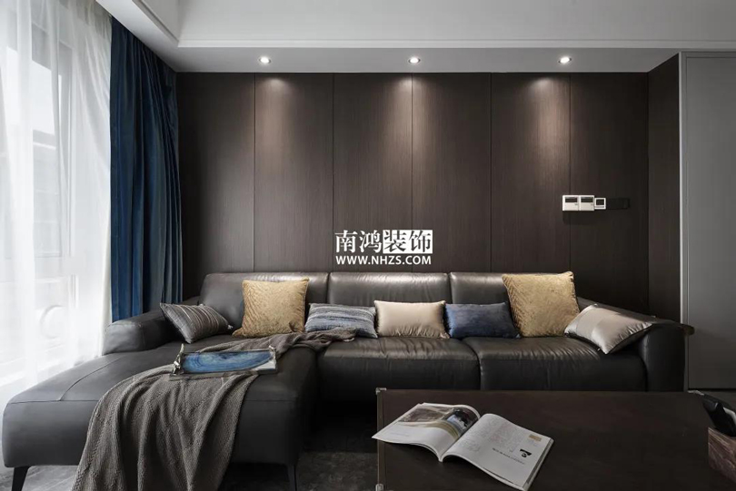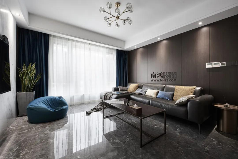 客廳通鋪石紋地磚,黑色皮質(zhì)沙發(fā)搭配方形現(xiàn)代茶幾,背景墻選用大面積KD板包覆,使得整體風(fēng)格簡潔明快,大氣爽朗。