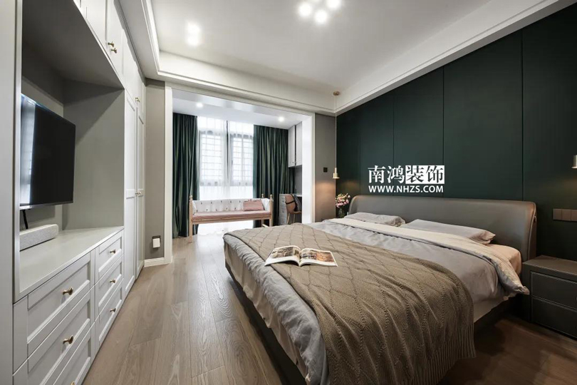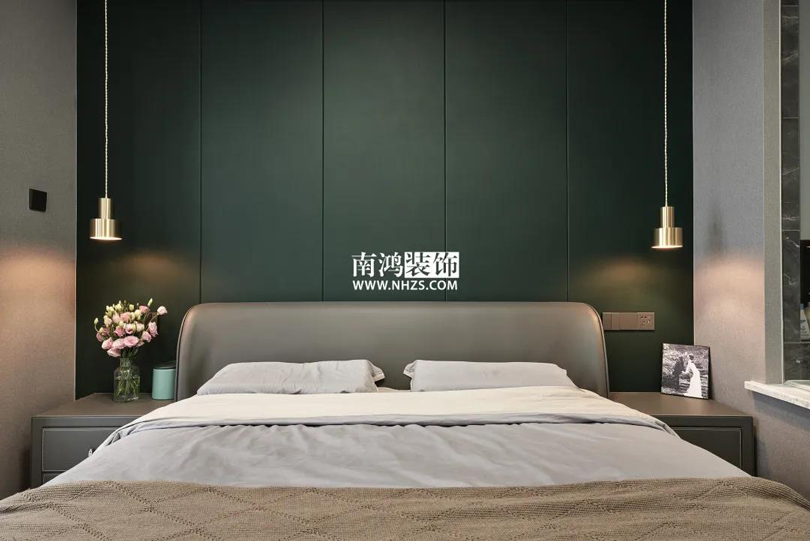 主臥內(nèi)包進(jìn)陽臺,增加采光,額外劃出了一塊休閑與工作的地方。室內(nèi)背景墻采用墨綠色硬包,結(jié)合棕色的床品,營造放松而舒適的休息環(huán)境,兩側(cè)的金屬材質(zhì)吊燈點(diǎn)綴出小輕奢格調(diào)。