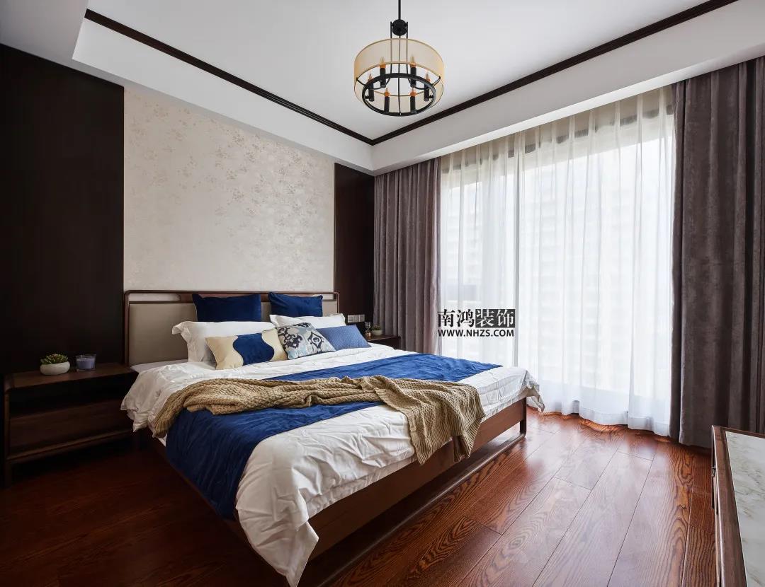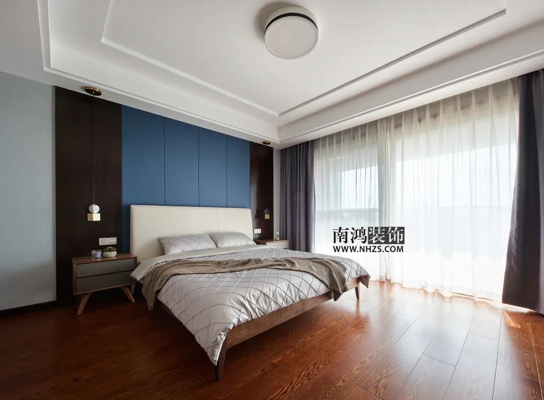 主臥背景選用亞麻色的印花墻紙,亞麻色比白色溫暖,比黃色低調(diào),搭配任何顏色都不會(huì)突兀。床品點(diǎn)綴深藍(lán),鮮活視覺(jué)。