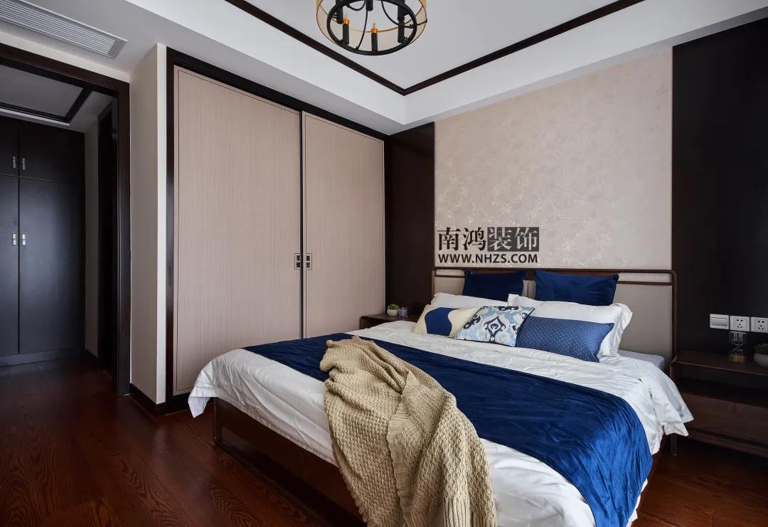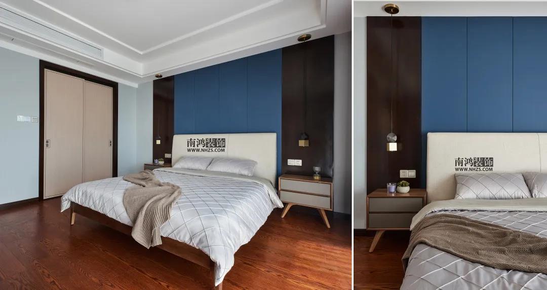 業(yè)主大兒子的房間,應(yīng)居住者需求,淡化了中式元素而更偏向現(xiàn)代風(fēng)格。雙層折邊吊頂簡(jiǎn)潔大氣,床頭背景墻選用藍(lán)色硬包結(jié)合木飾面,床頭柜上方設(shè)計(jì)了金屬色吊燈點(diǎn)綴空間。
