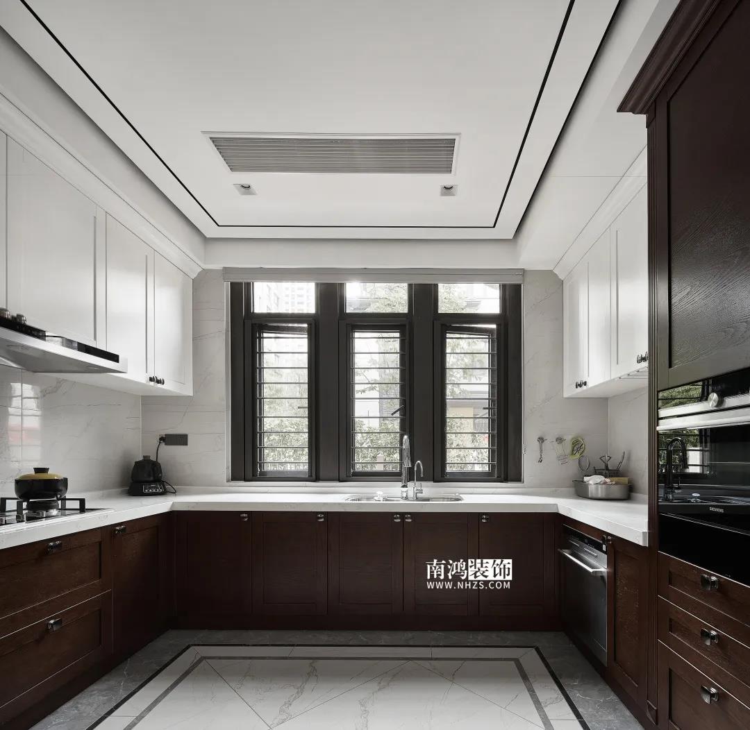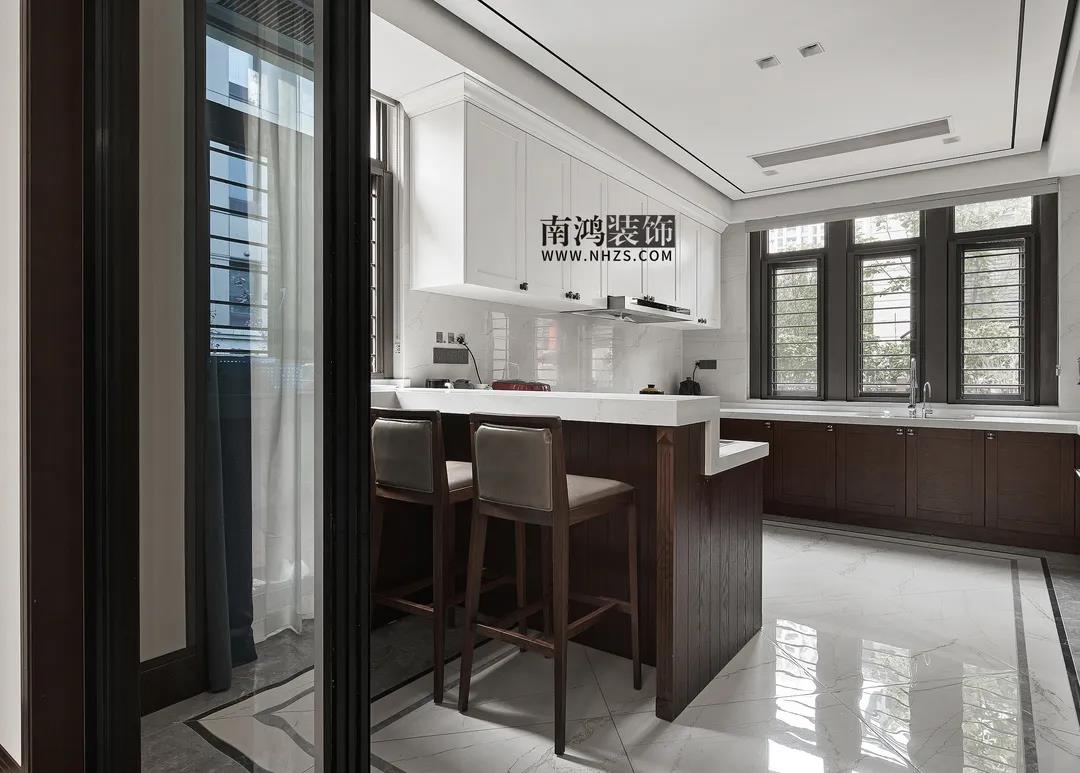 廚房,白色吊柜搭配木質(zhì)地柜,細(xì)致莊重,現(xiàn)代化的內(nèi)嵌廚電打造出設(shè)備齊全的料理空間,靠門一側(cè)還設(shè)計(jì)了吧臺(tái)。