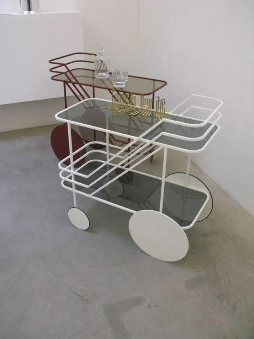 島臺和餐桌之間的過道很寬,除了吧臺凳,還擺了一個(gè)紅色酒車,這款酒車來自小眾家居品牌DANTE-Goods And Bads,是盧森堡設(shè)計(jì)師Christophe de la Fontaine的作品。