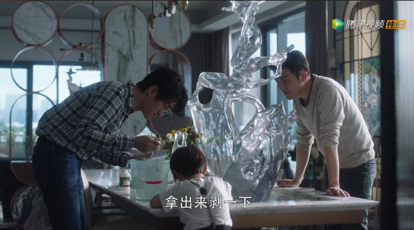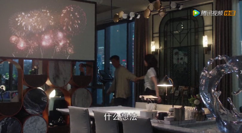 餐廳最夸張的設(shè)計(jì)是超長的大理石餐桌,一半用作就餐,一半做了一個(gè)淺水槽,槽內(nèi)布了一個(gè)超大的琉璃雕塑風(fēng)水局,因?yàn)樗f物,顧家是做煙花生意的,喬遷的時(shí)候不能過火盆,這個(gè)風(fēng)水局能讓生意風(fēng)生水起。