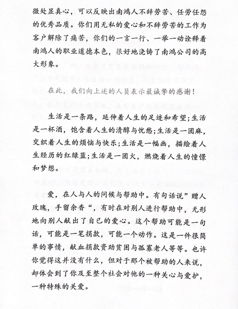 “你們用無私的愛心和不辭勞苦的工作為客戶解除了痛苦,你們的一言一行、一舉一動詮釋著南鴻人的職業(yè)道德本色,很好地澆筑了南鴻公司的高大形象。”