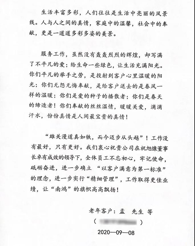 點贊函中,孟老先生對南鴻售后服務(wù)人員的服務(wù)給予了充分肯定,認為她辦事效率高,高度負責,能夠及時與維修部溝通,讓問題能夠快速傳達;維修部的汪師傅也對他非常尊重和體貼,不僅技術(shù)精湛,專業(yè)素質(zhì)過關(guān),還為解決問題盡心盡力,服務(wù)周到。